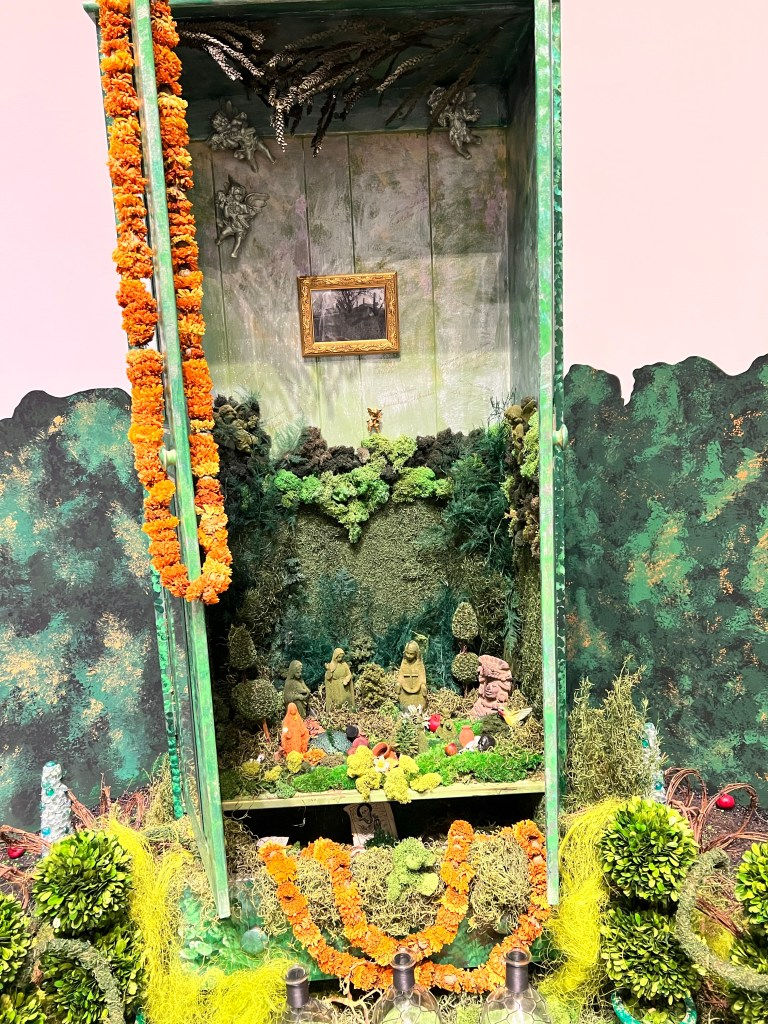 I left the DeYoung for Berkeley and, despite the thrill of Kehinde’s work, found Berkeley’s Museum much more exciting and vibrant. Amalisa Mesa-Bains ‘Archeology of Memory’ was a visually tactile stunner full of art one can feel with their lives, I mean eyes. The collages and ideas presented were richly detailed and moving. A mournful sense of memory creeped into me, as if I explored her installation of found objects. So detailed and specific, some installations felt like walking into a newly vacated room of someone who died. As if these mixed media cabinets and tablescapes were curations representing entire lives.